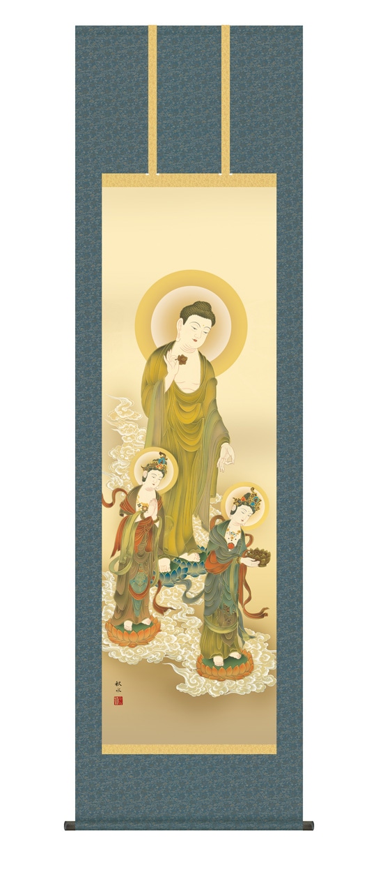 『阿弥陀三尊佛』 浮田秋水 洛彩緞子丸表装 掛軸 複製名画 宗教 仏画【ポイント5%還元中】