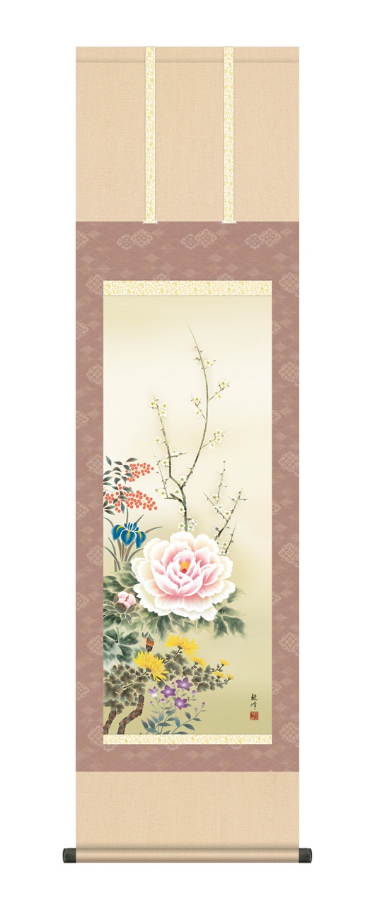 『四季花』 北山歩生 洛彩緞子本表装 掛軸 複製名画花鳥画【ポイント5%還元中】