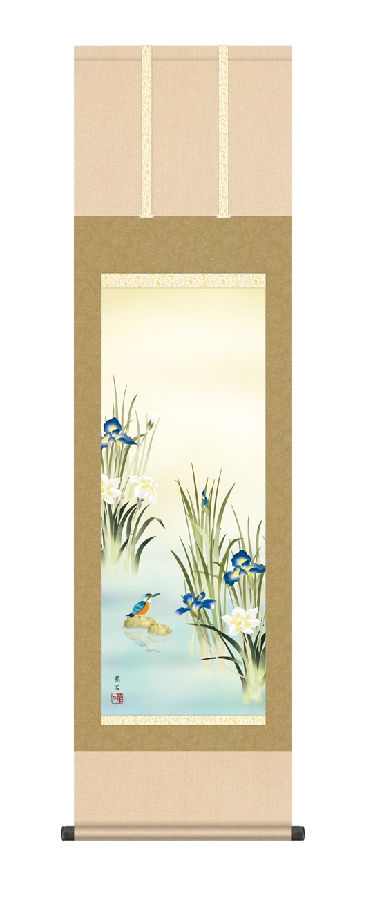 『菖蒲にかわせみ』 高見蘭石 洛彩緞子本表装 掛軸 複製名画 花鳥画【ポイント5%還元中】