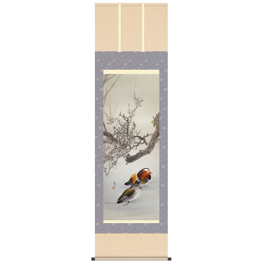 渡辺省亭『十二ケ月花鳥画』2月 紅梅鴛鴦 掛軸【ポイント5%還元中】