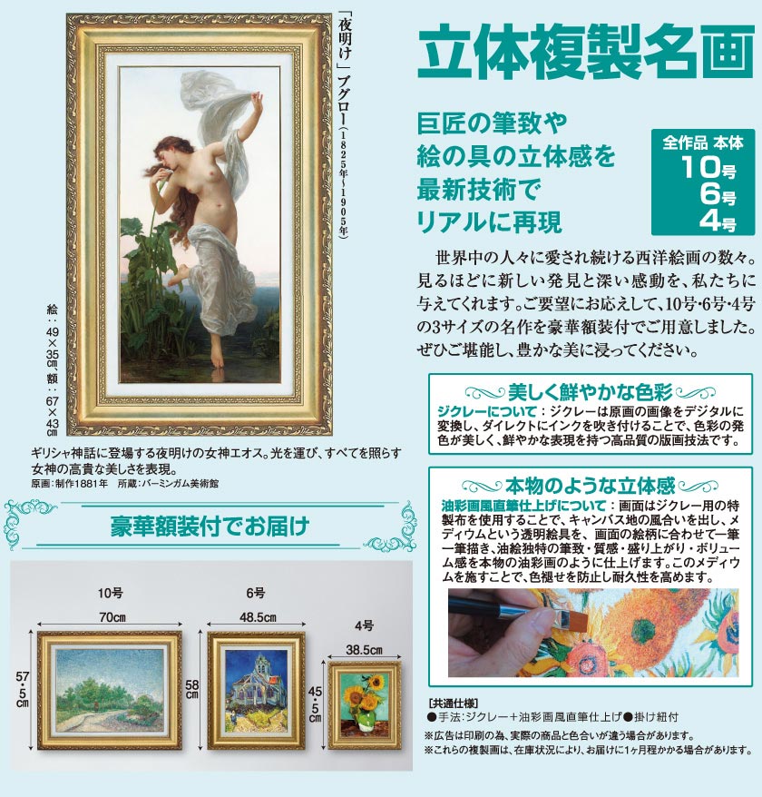 画面はジクレー用の特製布を使用することで、キャンバス地の風合いを出し、メディウムという透明絵具を、画面の絵柄に合わせて一筆一筆描き、油絵独特の筆致・質感・盛り上がり・ボリューム感を本物の油彩画のように仕上げます。このメディウムを施すことで、色褪せを防止し耐久性を高めます。